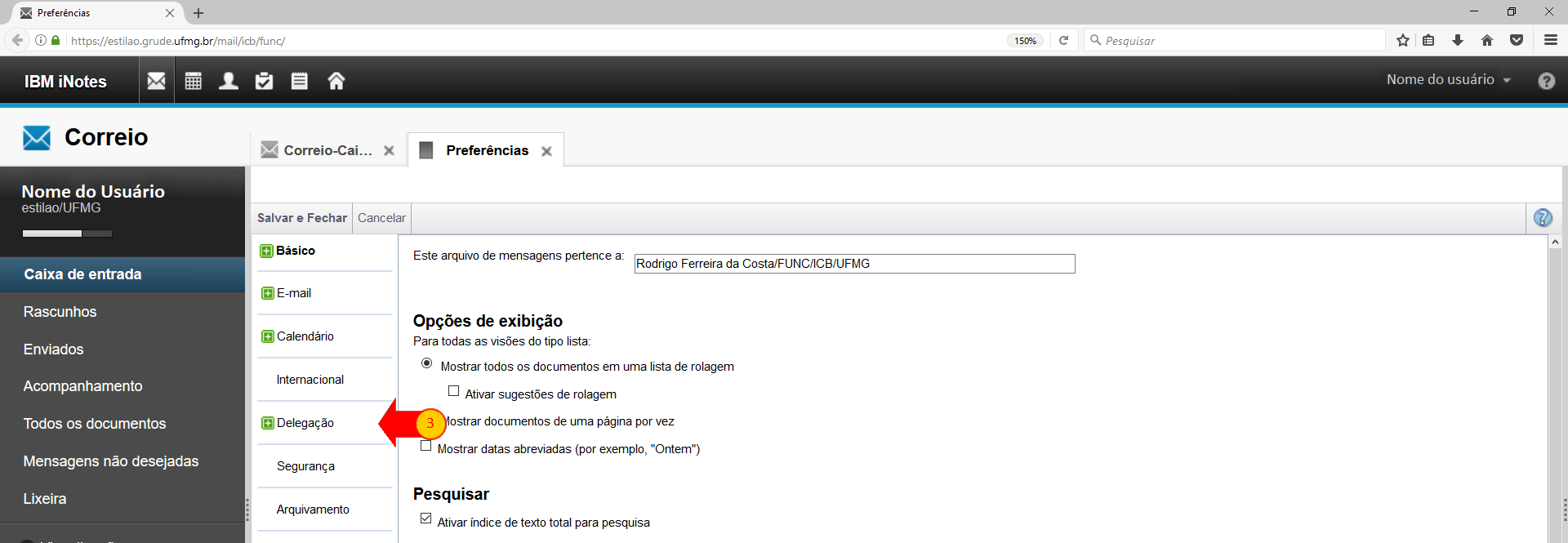3. Com a aba Preferências aberta, vá até o seu menu, e clique sobre Delegação.