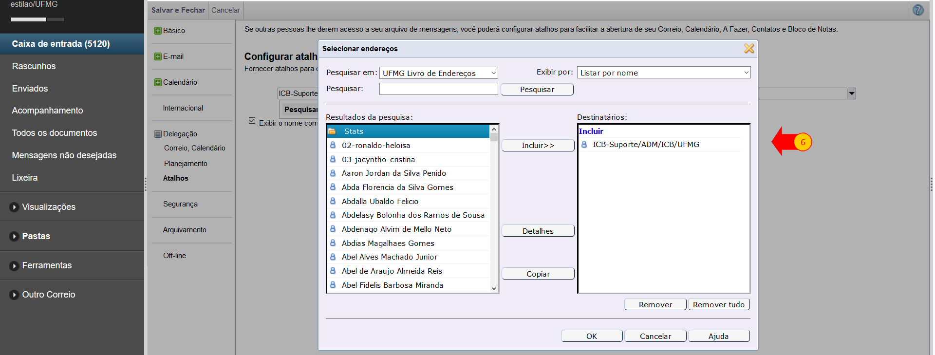 6. Uma “caixa” de Seleção de Endereços torna-se disponível para localizar a Caixa de Correio Institucional.