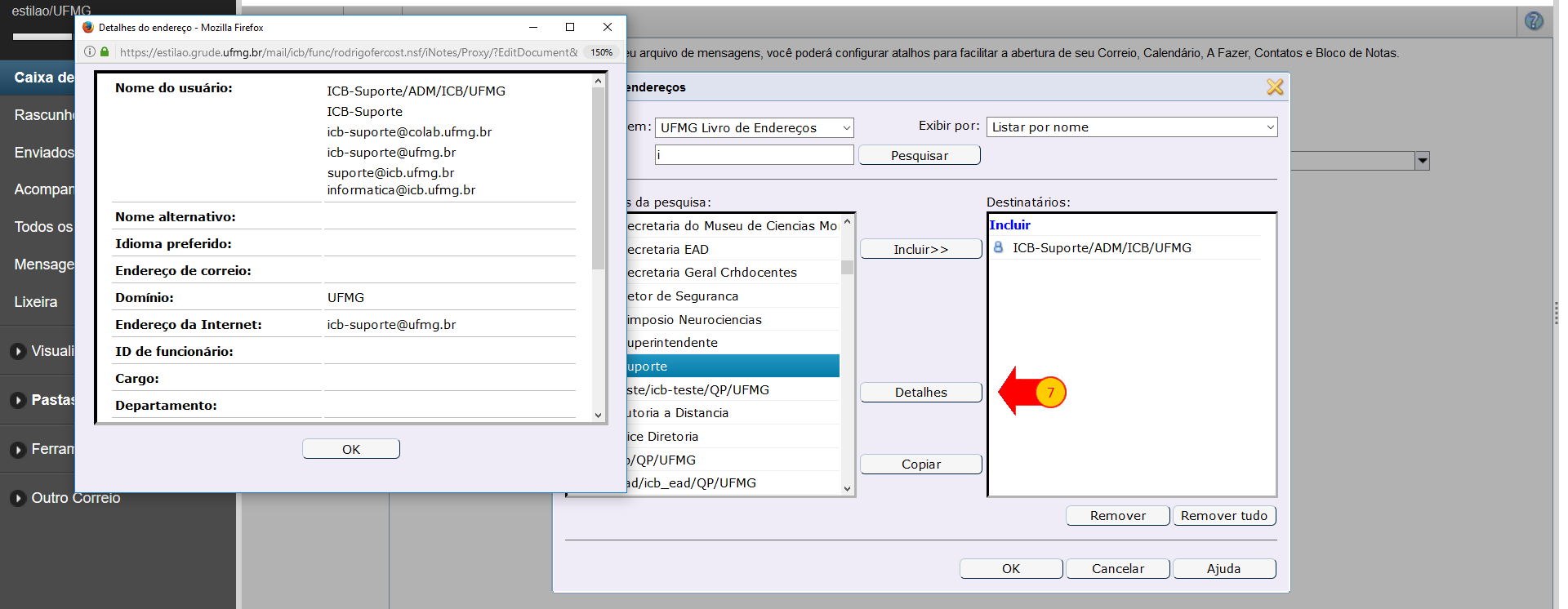 7. Caso não seja possível visualizar o nome completo da Caixa de Correio, você pode selecionar o “suposto” nome e clicar no botão detalhes, para que uma nova janela seja exibida com as informações completas do “usuário”.