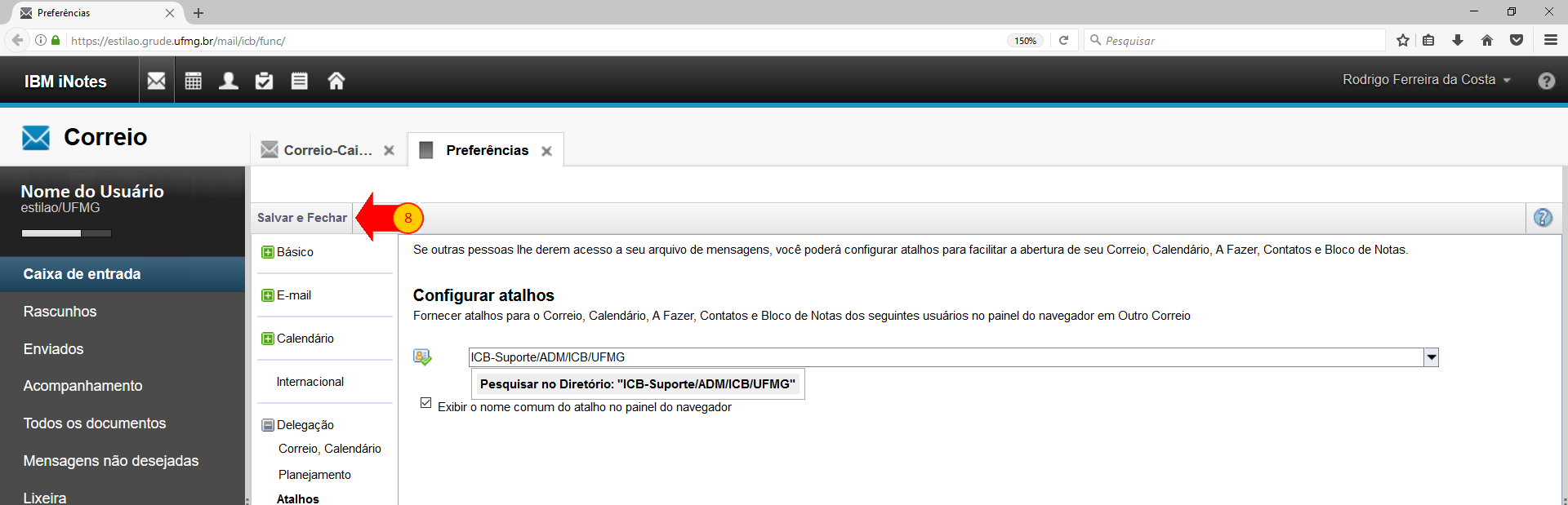 8. Após localizar a Caixa de Correio desejada, observe que o nome da Caixa deve estar dentro da caixa de seleção, clique em Salvar e Fechar.