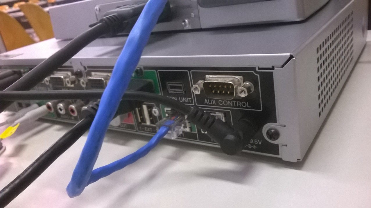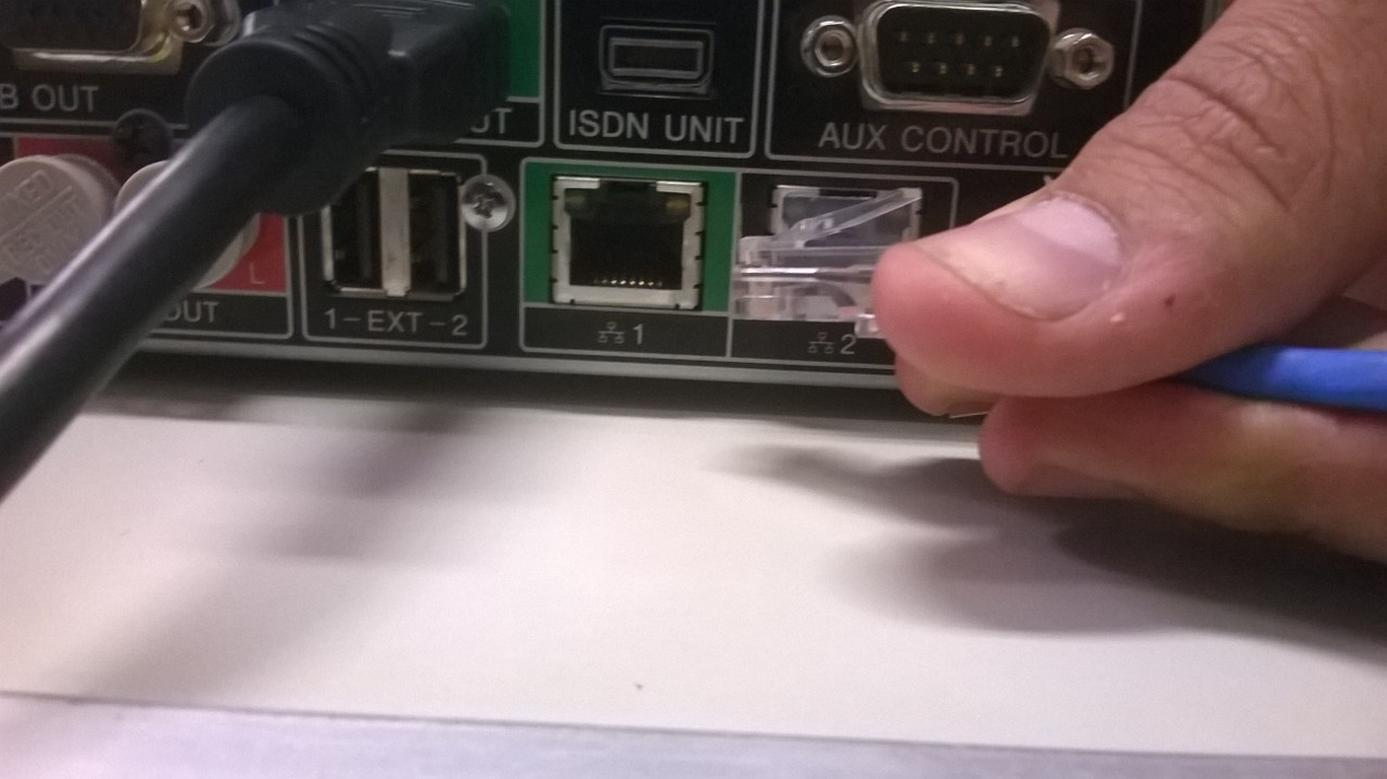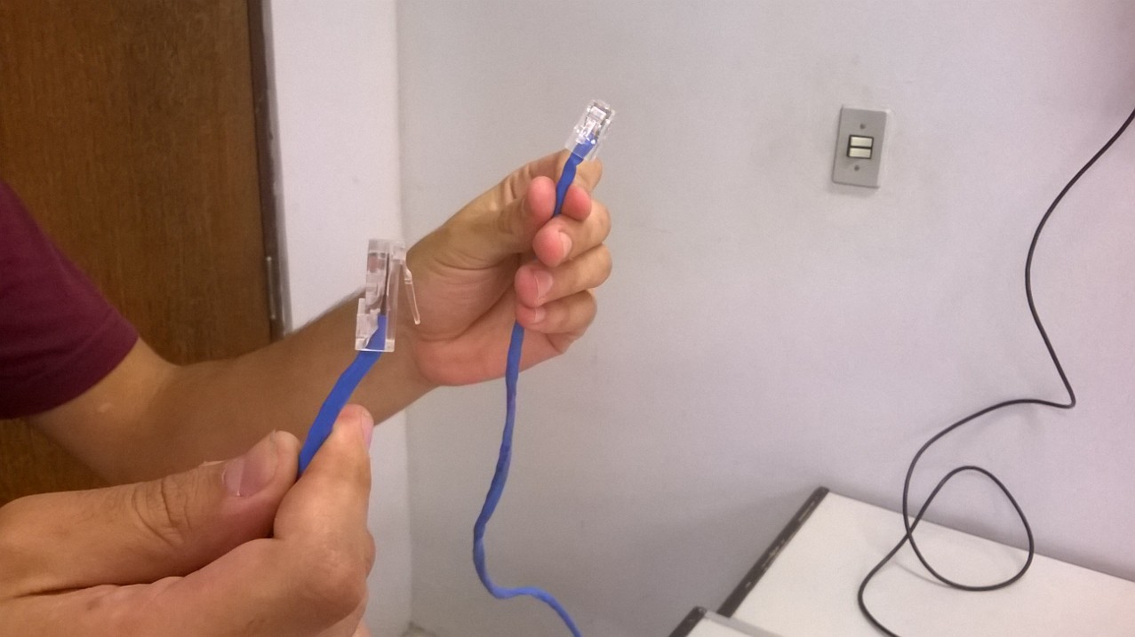 Ligar uma ponta do cabo de rede na traseira do aparelho (na conexão número 1) e outra na saída que se encontra na parede lateral. O cabo pode ficar no chão ou ser passado por cima da porta com a ajuda de uma fita, de acordo com a preferência de quem estiver utilizando.
