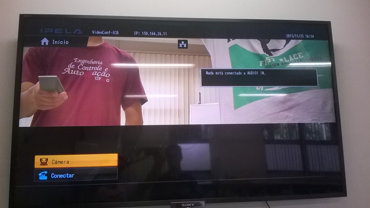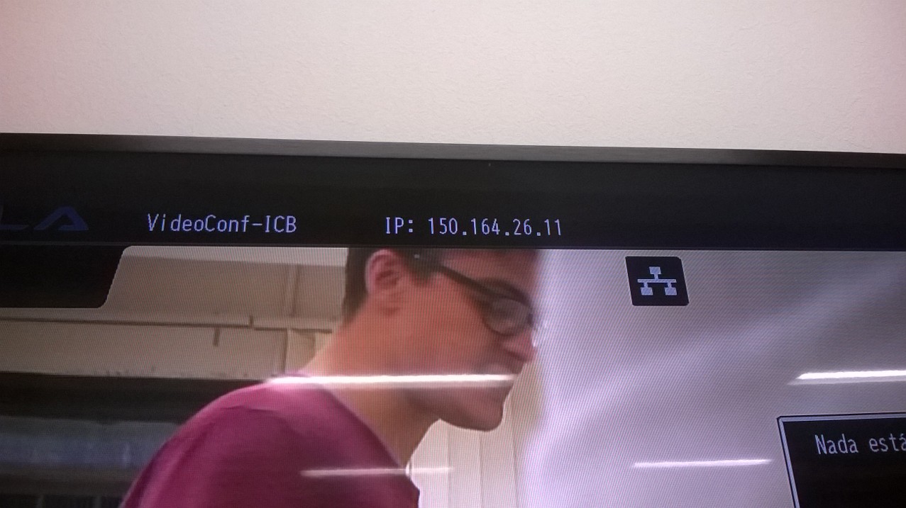 Depois de carregado, a tela abaixo deverá aparecer, mostrando a imagem captada pela câmera do sistema. Repare que logo acima na TV deverá aparecer o IP fixo do aparelho, 150.164.34.111. Este será o número que a pessoa do outro lado da conexão deverá utilizar para ver-nos e ouvir-nos (ou o host videoconferencia.icb.ufmg.br).