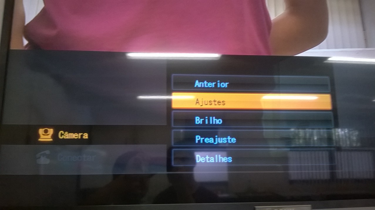 Se acaso desejar modificar o lado ou altura para o qual a câmera aponta, entrar (utilizando o controle remoto cinza da Sony) na opção Câmera, depois Ajustes. Com os botões direcionais deverá efetuar as mudanças desejadas.