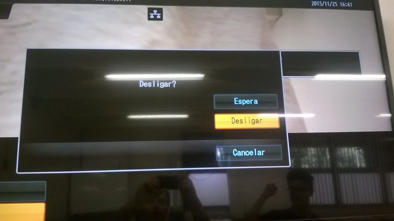 Quando terminar, o procedimento é bem simples. Primeiro pressione o botão de desligar/ligar do controle do aparelho (controle cinza), conforme foto. Quando aparecer a mensagem perguntando se deseja desligar, escolha DESLIGAR e aperte o botão ENTER no controle.